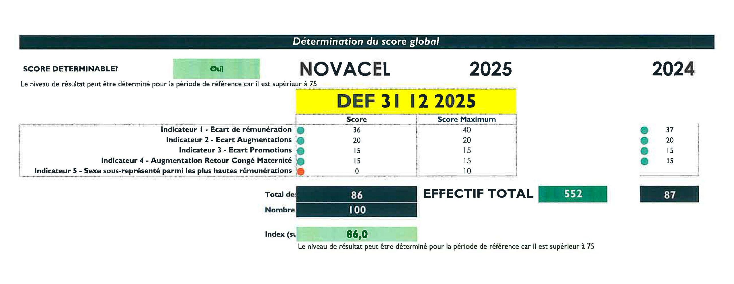 INDEX EGALITE FEMMES HOMMES : Novacel obtient un score de 86/100 à l’index de l’égalité femmes-hommes Mis à jour le 26/02/2026